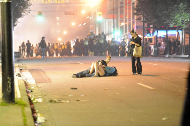 Серед хмар сльозогінного газу і палаючих поліцейських машин фотограф Річ Лем зробив фотографію, яка облетіла весь світ: посеред всього цього хаосу на землі цілується парочка закоханих.