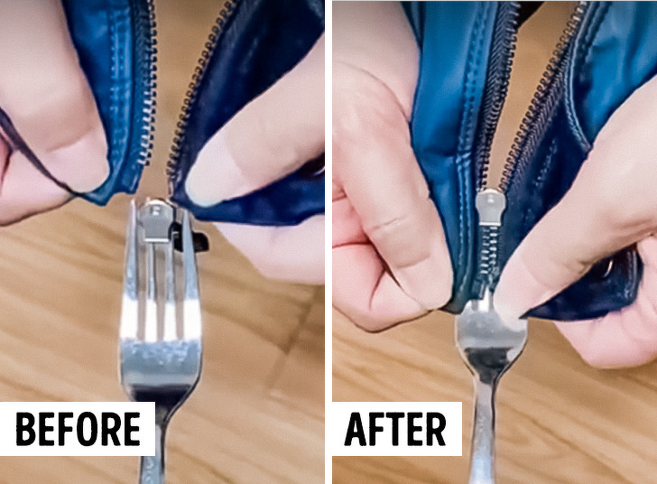 За допомогою вилки можна застебнути зіскочившу блискавку, тільки потрібно ще чимось зафіксувати нижній край – вузликом або клеєм