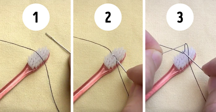 Щоб всунути нитку в голку, потрібно покласти нитку на зубну щітку, придавити голкою і підтягнути петельку іншою голкою